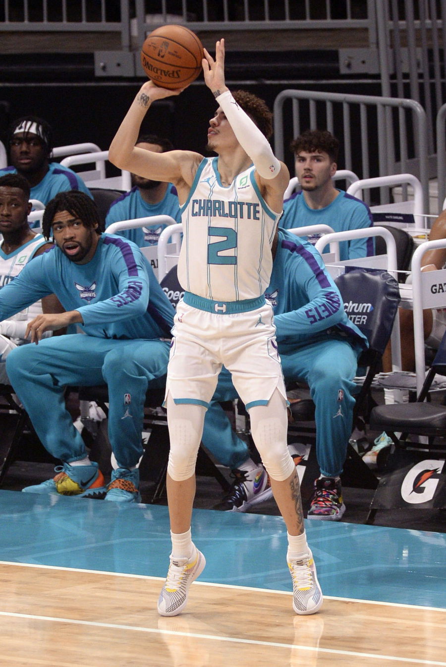 Hornets guard LaMelo Ball (2) shoots during the first half against the Raptors at the Spectrum Center. Mandatory Credit: Sam Sharpe-USA TODAY Sports