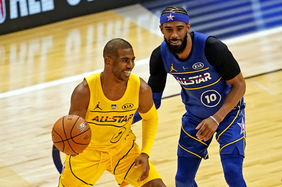 Team LeBron’s Chris Paul against Team Durant’s Mike Conley during the 2021 NBA All-Star Game at State Farm Arena. Mandatory Credit: Dale Zanine-USA TODAY Sports