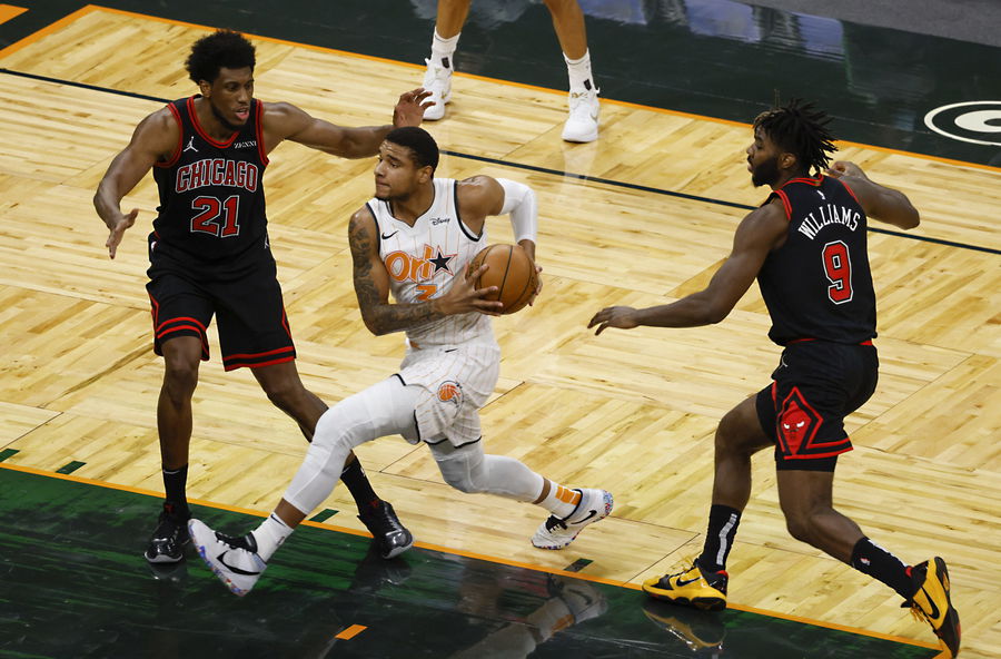 Feb 5, 2021; Orlando, Florida, USA; Orlando Magic forward Chuma Okeke (3) drives to the hoop between Chicago Bulls forwards Patrick Williams (9) and Thaddeus Young (21) during the fourth quarter at Amway Center. Mandatory Credit: Reinhold Matay-USA TODAY Sports