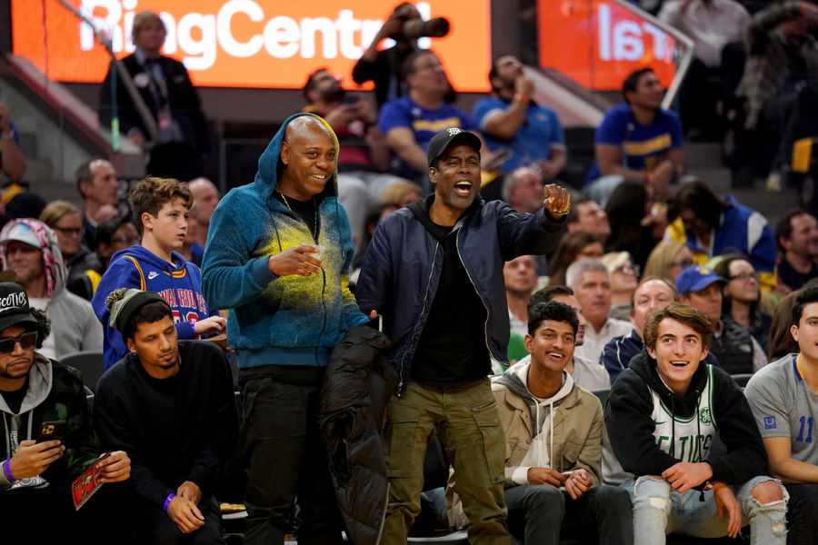 Dec 10, 2022; San Francisco, California, USA; Comedians Dave Chapelle and Chris Rock react during a game between the Golden State Warriors and the Boston Celtics at the Chase Center. Mandatory Credit: Cary Edmondson-USA TODAY Sports