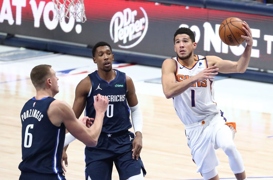 Feb 1, 2021; Dallas, Texas, USA; Phoenix Suns guard Devin Booker (1) drives to the basket past Dallas Mavericks guard Josh Richardson (0) and forward Kristaps Porzingis (6) during the first quarter at American Airlines Center. Mandatory Credit: Kevin Jairaj-USA TODAY Sports