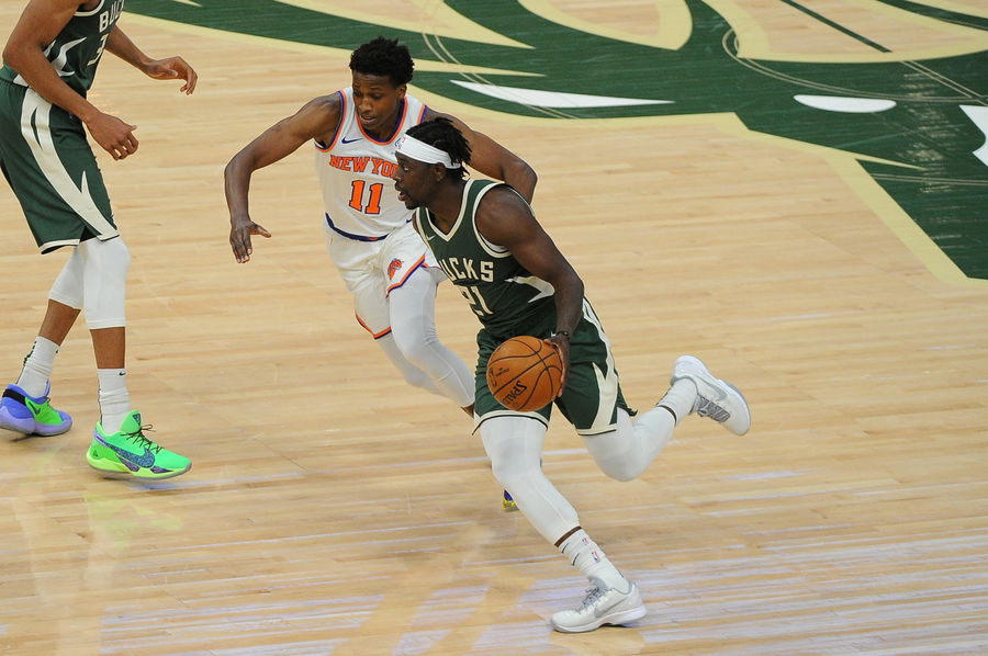Mar 11, 2021; Milwaukee, Wisconsin, USA; Milwaukee Bucks guard Jrue Holiday (21) pushes the ball up court against New York Knicks guard Frank Ntilikina (11) during the fourth quarter at Fiserv Forum. Mandatory Credit: Michael McLoone-USA TODAY Sports