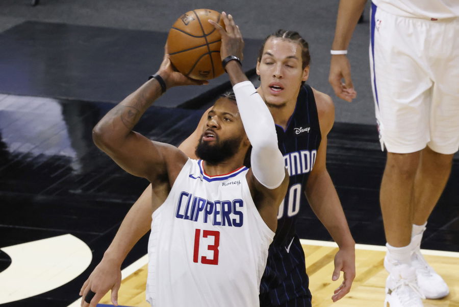Jan 29, 2021; Orlando, Florida, USA; LA Clippers guard Paul George (13) shoots the ball in front of Orlando Magic forward Aaron Gordon (00) during the third quarter at Amway Center. Mandatory Credit: Reinhold Matay-USA TODAY Sports