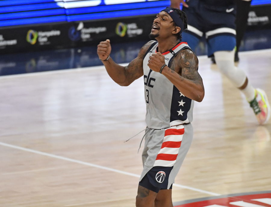 Feb 27, 2021; Washington, District of Columbia, USA; Washington Wizards guard Bradley Beal (3) reacts after a three point basket against the Minnesota Timberwolves during the third quarter at Capital One Arena. Mandatory Credit: Brad Mills-USA TODAY Sports
