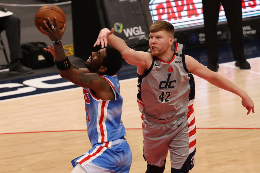 Jan 31, 2021; Washington, District of Columbia, USA; Brooklyn Nets guard Kyrie Irving (11) shoots the ball as Washington Wizards forward Davis Bertans (42) defends in the fourth quarter at Capital One Arena. Mandatory Credit: Geoff Burke-USA TODAY Sports