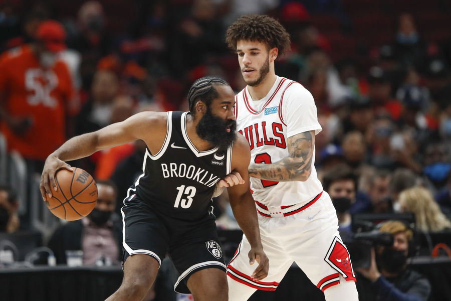 Nov 8, 2021; Chicago, Illinois, USA; Chicago Bulls guard Lonzo Ball (2) defends against the Brooklyn Nets guard James Harden (13) during the first half at United Center. Mandatory Credit: Kamil Krzaczynski-USA TODAY Sports