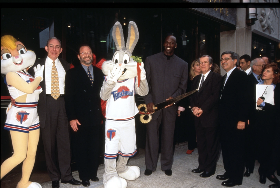 Michael Jordan, Bugs and Lola Bunny, and others in 1996. | Evan Agostini/Liaison via Getty Images