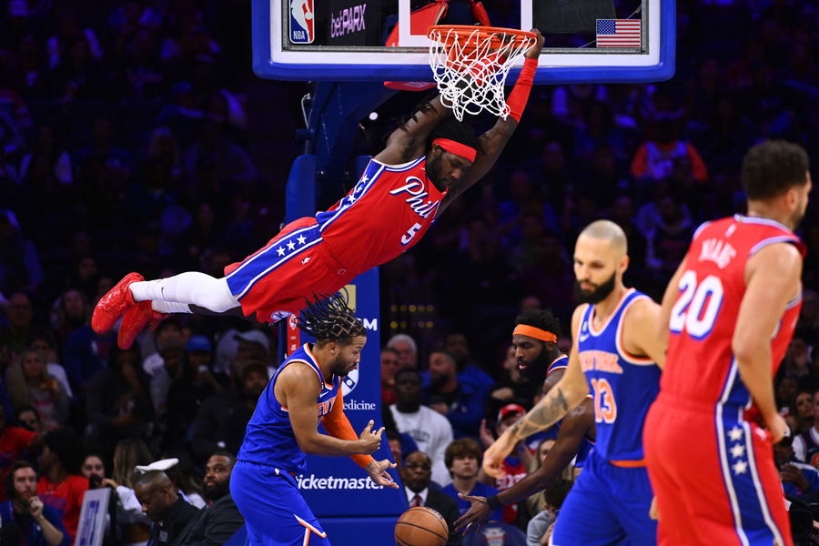Nov 4, 2022; Philadelphia, Pennsylvania, USA; Philadelphia 76ers center Montrezl Harrell (5) hangs on the net over New York Knicks guard Jalen Brunson (11) after a dunk in the second quarter at Wells Fargo Center. Mandatory Credit: Kyle Ross-USA TODAY Sports