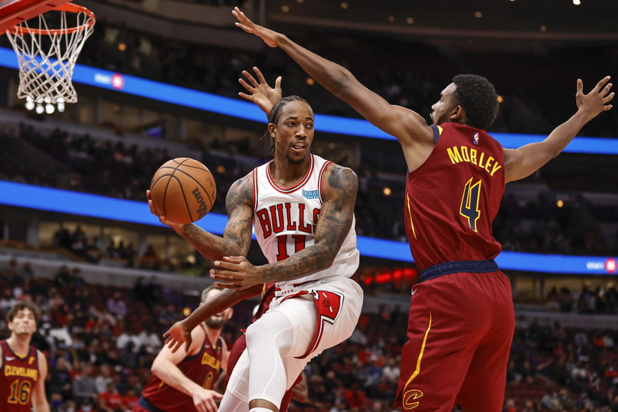 Oct 5, 2021; Chicago, Illinois, USA; Chicago Bulls forward DeMar DeRozan (11) passes the ball against Cleveland Cavaliers center Evan Mobley (4) during the first half of a preseason NBA game at United Center. Mandatory Credit: Kamil Krzaczynski-USA TODAY Sports