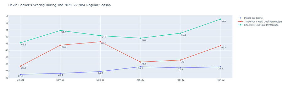 Devin Booker’s Scoring During The 2021-22 NBA Regular Season (Stats Valid as of 23rd March 2022)