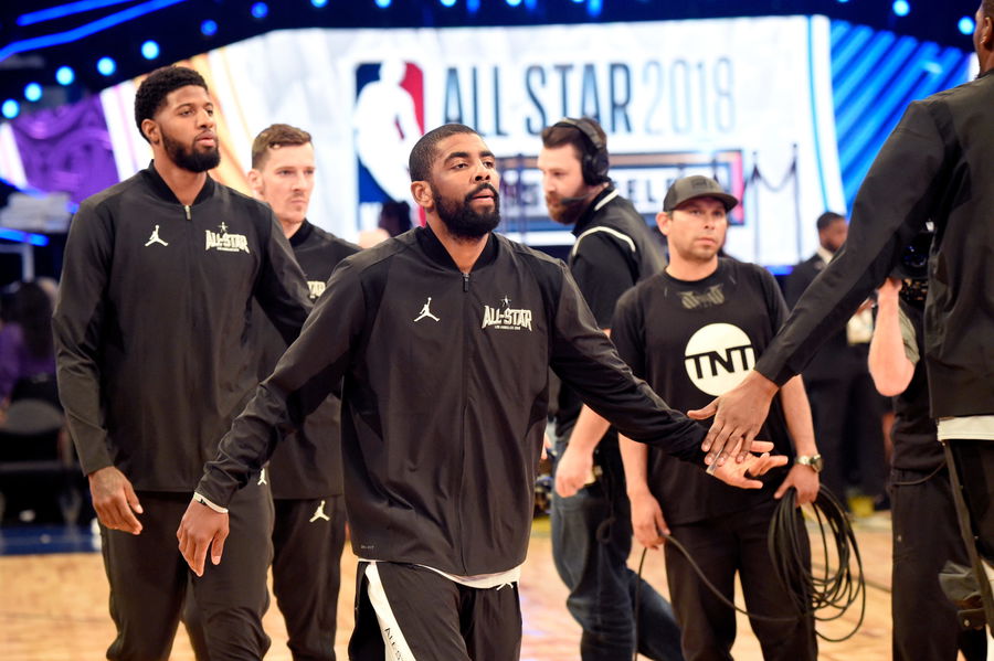 LOS ANGELES, CA – FEBRUARY 18: (L-R) Paul George, Goran Dragic, and Kyrie Irving warm up at the 67th NBA All-Star Game: Team LeBron Vs. Team Stephen at Staples Center on February 18, 2018 in Los Angeles, California. (Photo by Kevin Mazur/WireImage)