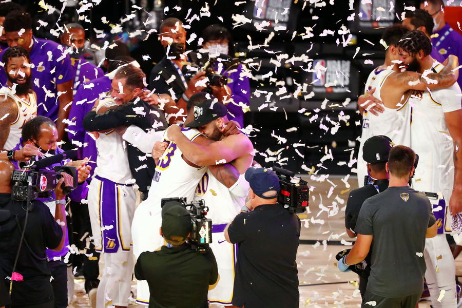Oct 11, 2020; Lake Buena Vista, Florida, USA; Los Angeles Lakers forward LeBron James (23) hugs forward Jared Dudley (10) after win over the Miami Heat after game six of the 2020 NBA Finals at AdventHealth Arena. The Los Angeles Lakers won 106-93 to win the series. Mandatory Credit: Kim Klement-USA TODAY Sports