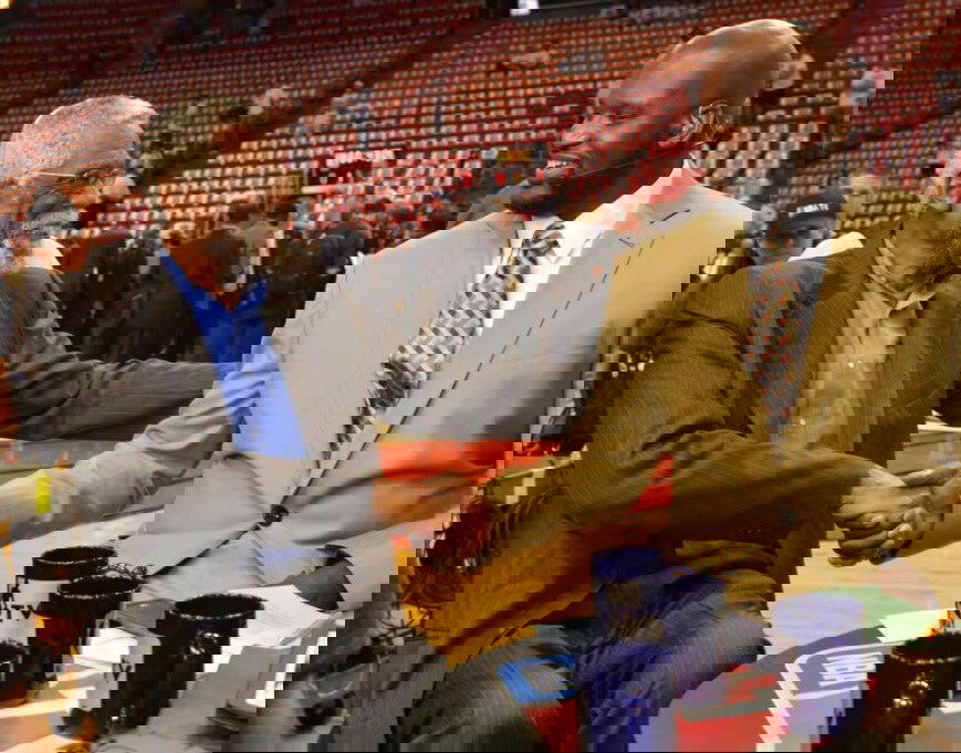 Soon after, Shaq shatters the backboard glass with a nasty dunk. However, the group of the NBA legends don’t seem that impressed by the showing. Instead, they hand the Lakers legend a broom to clean up the broken glass.