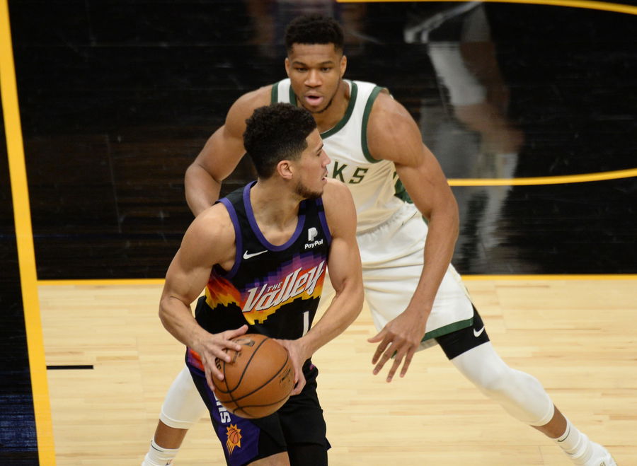 Feb 10, 2021; Phoenix, Arizona, USA; Phoenix Suns guard Devin Booker (1) protects the ball from Milwaukee Bucks forward Giannis Antetokounmpo (34) during the first half at Phoenix Suns Arena. Mandatory Credit: Joe Camporeale-USA TODAY Sports