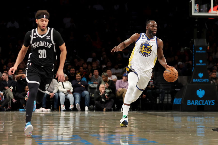 Dec 21, 2022; Brooklyn, New York, USA; Golden State Warriors forward Draymond Green (23) brings the ball up court against Brooklyn Nets guard Seth Curry (30) during the second quarter at Barclays Center. Mandatory Credit: Brad Penner-USA TODAY Sports