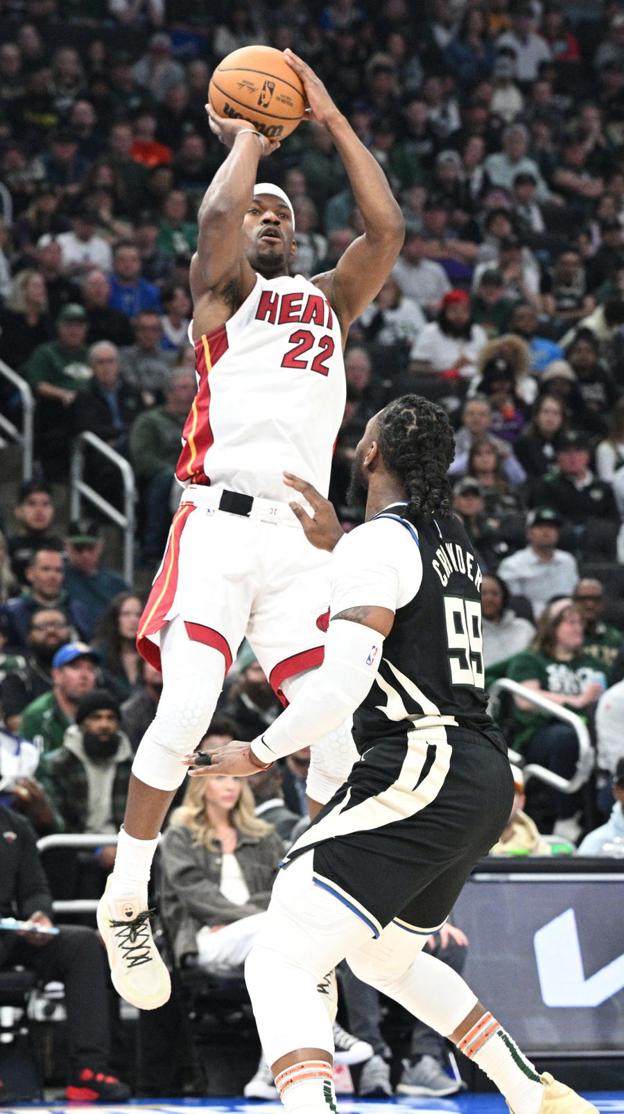 Apr 16, 2023; Milwaukee, Wisconsin, USA; Miami Heat forward Jimmy Butler (22) shoots the ball against Milwaukee Bucks forward Jae Crowder (99) in the first half during game one of the 2023 NBA Playoffs at Fiserv Forum. Mandatory Credit: Michael McLoone-USA TODAY Sports