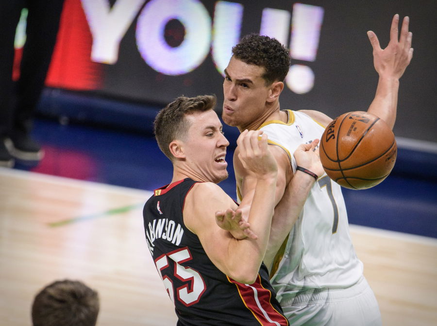 Jan 1, 2021; Dallas, Texas, USA; Dallas Mavericks center Dwight Powell (7) defends against Miami Heat forward Duncan Robinson (55) during the second half at the American Airlines Center. Mandatory Credit: Jerome Miron-USA TODAY Sports