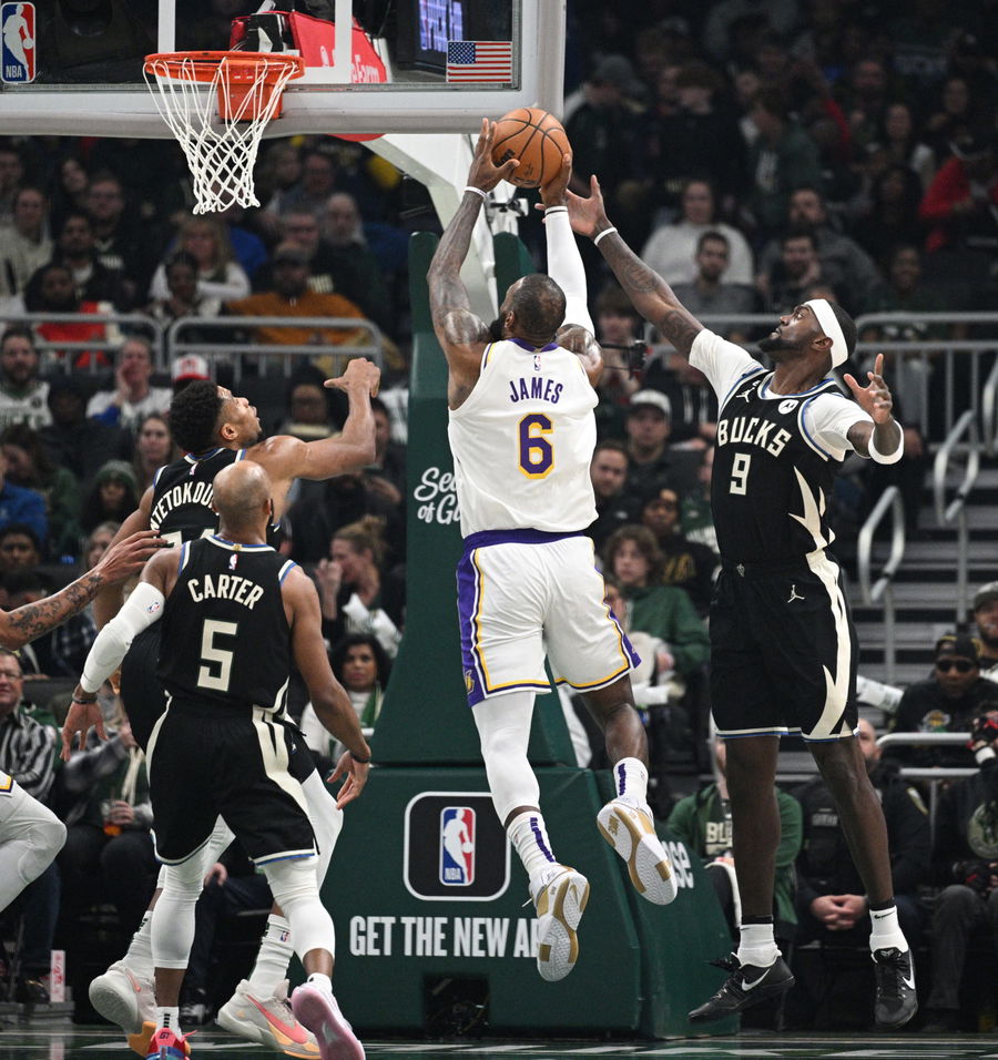 Dec 2, 2022; Milwaukee, Wisconsin, USA; Los Angeles Lakers forward LeBron James (6) goes up for a shot against Milwaukee Bucks forward Bobby Portis (9) in the first half at Fiserv Forum. Mandatory Credit: Michael McLoone-USA TODAY Sports
