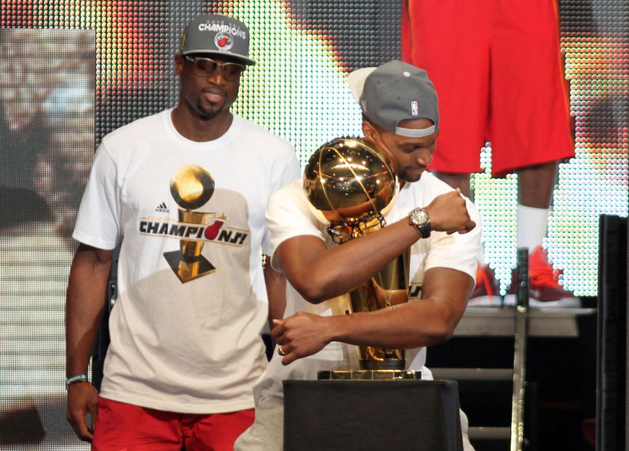 MIAMI, FL – JUNE 25: Dwyane Wade and Chris Bosh participate in Miami Heat 2012 NBA Championship Celebration at AmericanAirlines Arena on June 25, 2012 in Miami, Florida. (Photo by Alexander Tamargo/WireImage)