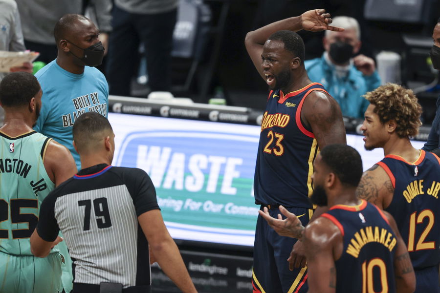 Feb 20, 2021; Charlotte, North Carolina, USA; Golden State Warriors forward Draymond Green (23) reacts to receiving a technical foul during the second half at Spectrum Center against the Charlotte Hornets. The Charlotte Hornets won 102-100. Mandatory Credit: Nell Redmond-USA TODAY Sports
