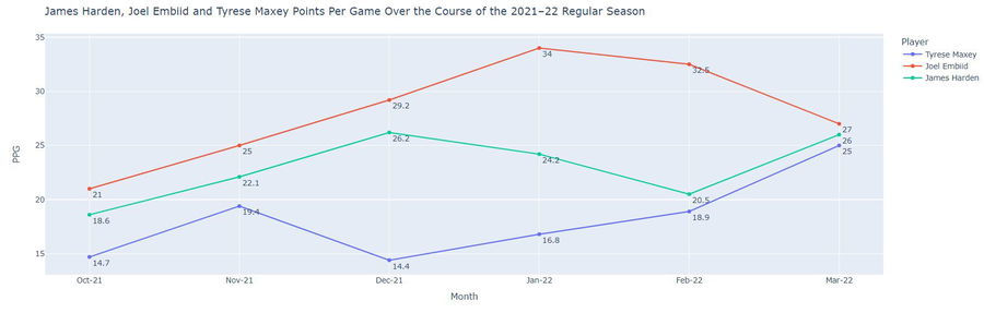 James Harden, Joel Embiid and Tyrese Maxey Points Per Game Over the Course of the 2021–22 Regular Season (Stats valid as of 3rd March 2022)