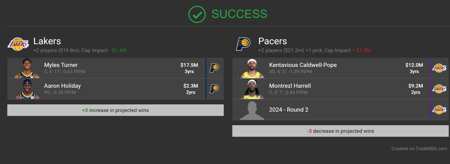 Pacers Receive- Montrezl Harrell, Kentavious Caldwell Pope, and 2024 Second-Round Pick via Lakers.