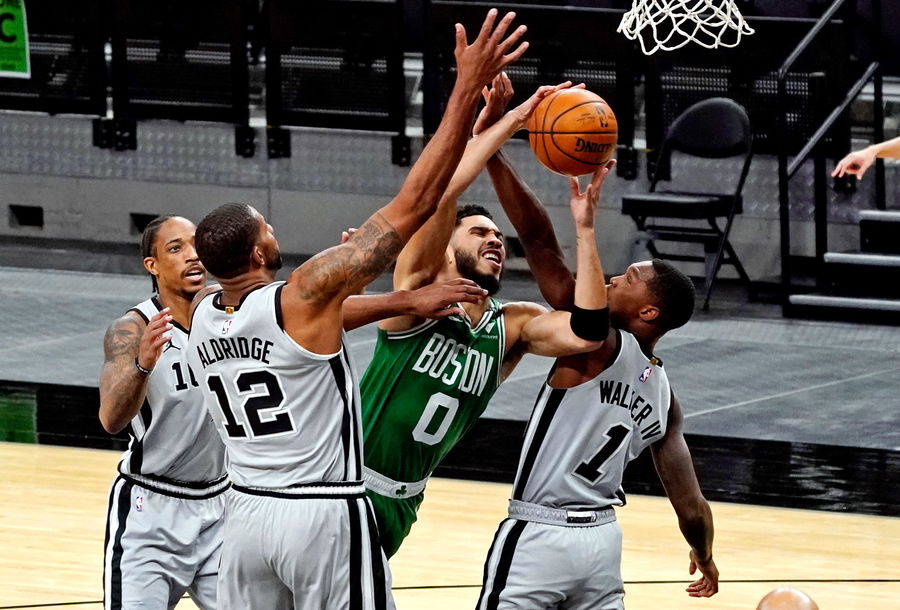 Jan 27, 2021; San Antonio, Texas, USA; Boston Celtics forward Jayson Tatum (0) shoots the ball against San Antonio Spurs center LaMarcus Aldridge (12) during the first quarter at AT&T Center. Mandatory Credit: Scott Wachter-USA TODAY Sports