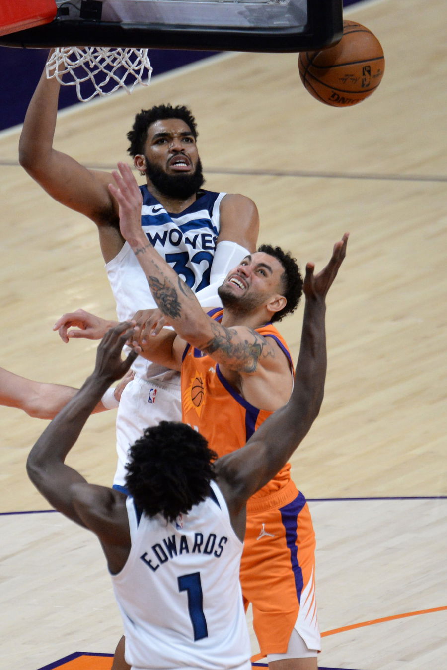 Mar 19, 2021; Phoenix, Arizona, USA; Phoenix Suns forward Abdel Nader (11) battles Minnesota Timberwolves forward Anthony Edwards (1) and Minnesota Timberwolves center Karl-Anthony Towns (32) for a rebound during the second half at Phoenix Suns Arena. Mandatory Credit: Joe Camporeale-USA TODAY Sports