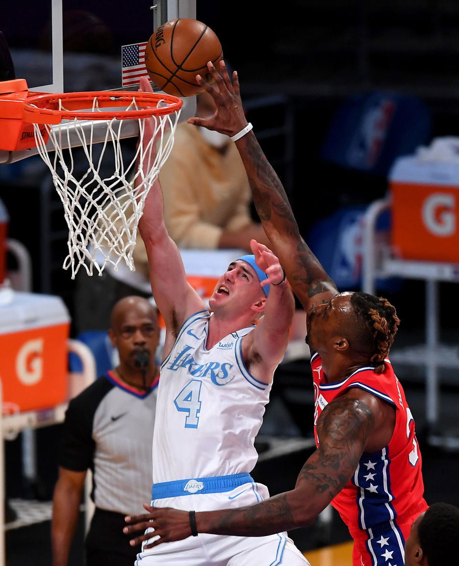76ers’ Dwight Howard blocks a shot by the Lakers’ Alex Caruso in the first half of the game at Staples Center. Mandatory Credit: Jayne Kamin-Oncea-USA TODAY Sports