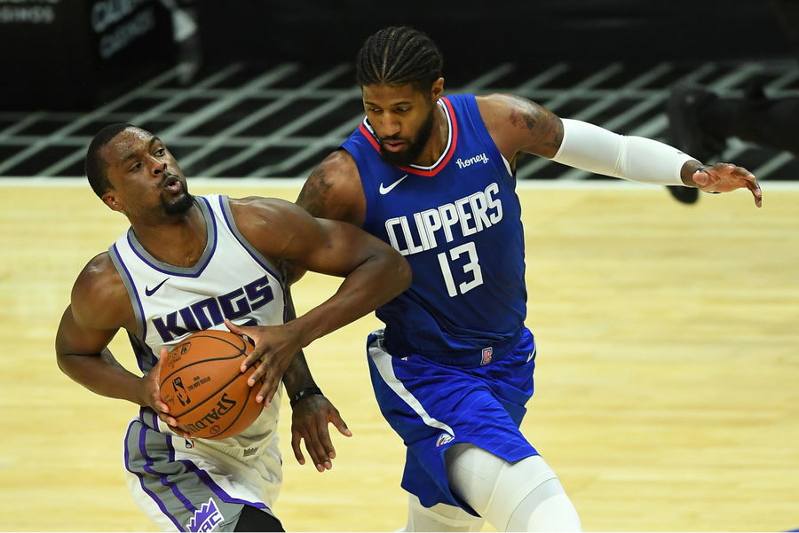 Jan 20, 2021; Los Angeles, California, USA; Sacramento Kings guard De’Aaron Fox (5) has the ball knocked loose by Los Angeles Clippers guard Paul George (13) as he drives to the basket in the first half of the game at Staples Center. Mandatory Credit: Jayne Kamin-Oncea-USA TODAY Sports