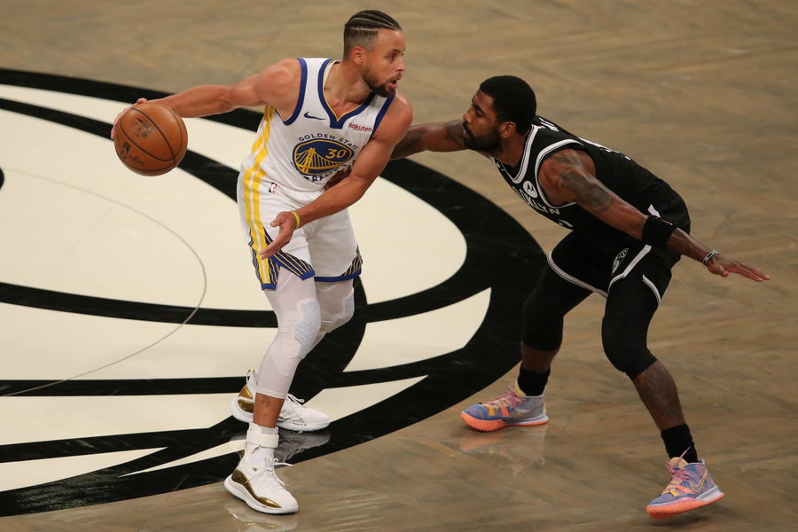 Dec 22, 2020; Brooklyn, New York, USA; Golden State Warriors point guard Stephen Curry (30) controls the ball against Brooklyn Nets point guard Kyrie Irving (11) during the first quarter at Barclays Center. Mandatory Credit: Brad Penner-USA TODAY Sports
