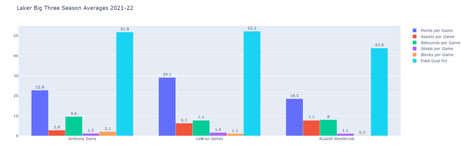 Season Averages of Anthony Davis, LeBron James, and Russell Westbrook (Stats valid as of 27th Jan 2022)