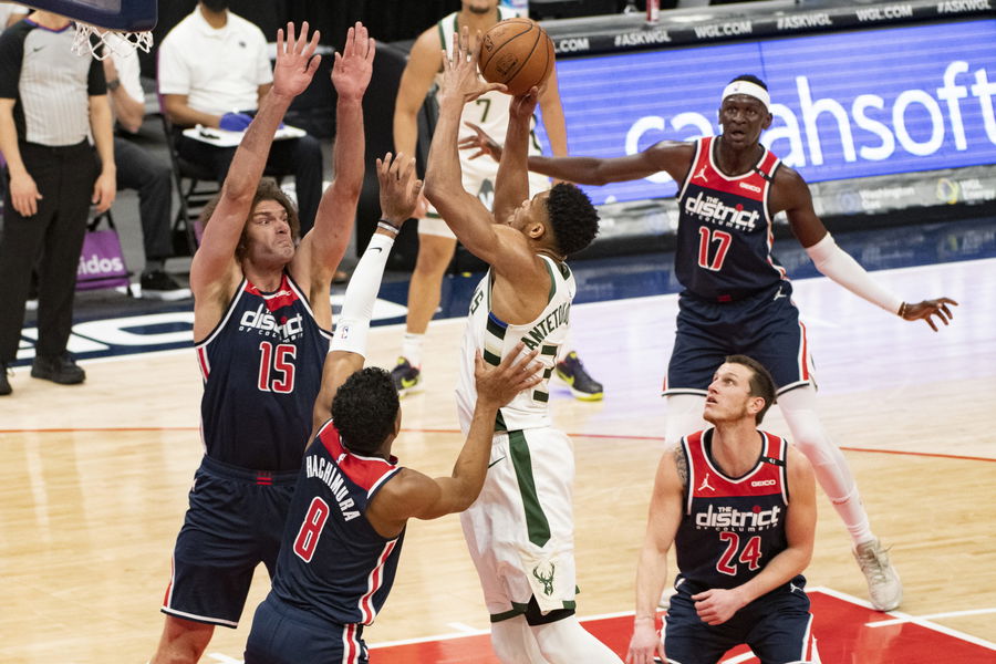 Mar 13, 2021; Washington, District of Columbia, USA; Washington Wizards center Robin Lopez (15) defends Milwaukee Bucks forward Giannis Antetokounmpo (34) shoot attempt during the first half at Capital One Arena. Mandatory Credit: Tommy Gilligan-USA TODAY Sports