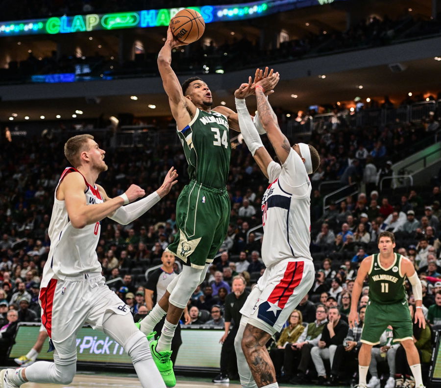 Jan 3, 2023; Milwaukee, Wisconsin, USA; Milwaukee Bucks forward Giannis Antetokounmpo (34) takes a shot between Washington Wizards forward Kristaps Porzingis (6) and center Daniel Gafford (21) in the fourth quarter at Fiserv Forum. Mandatory Credit: Benny Sieu-USA TODAY Sports
