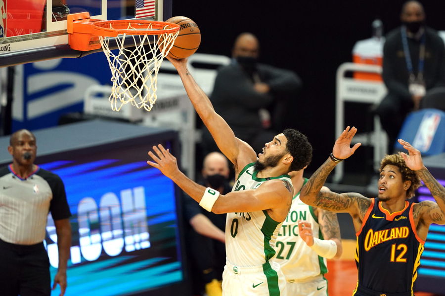 Feb 2, 2021; San Francisco, California, USA; Boston Celtics forward Jayson Tatum (0) scores inside during the second quarter against the Golden State Warriors at Chase Center. Mandatory Credit: Darren Yamashita-USA TODAY Sports