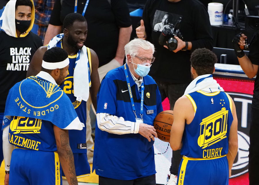 Jan 8, 2021; San Francisco, California, USA; Retiring after 57 years, Golden State Warriors scorekeeper Fred Kast is given a signed game ball from guard Stephen Curry (30) after a win against the Los Angeles Clippers at Chase Center. Mandatory Credit: Kelley L Cox-USA TODAY Sports