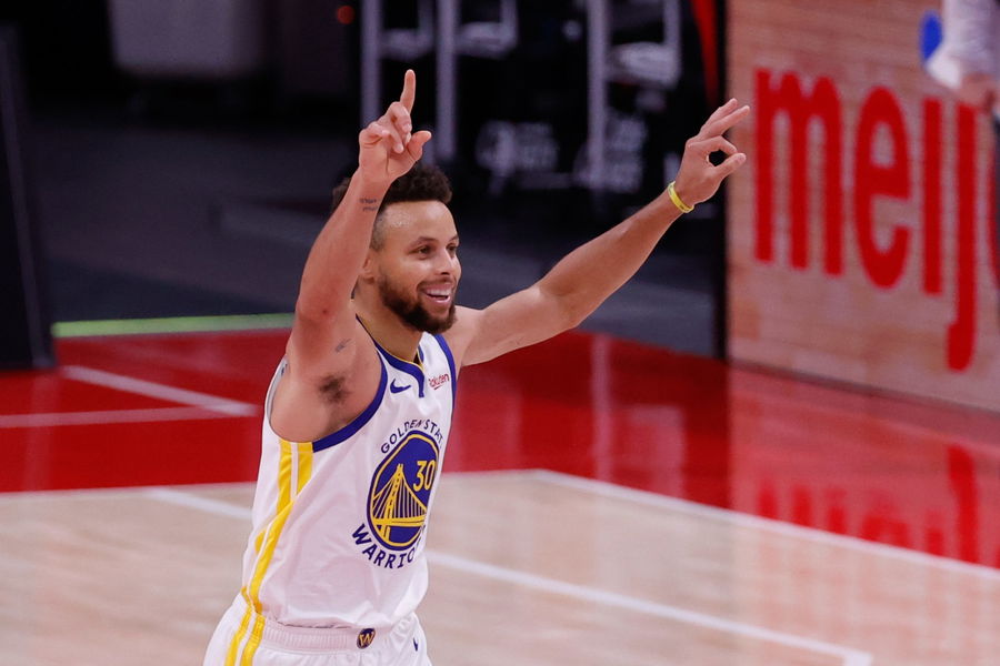 Dec 29, 2020; Detroit, Michigan, USA; Golden State Warriors guard Stephen Curry (30) celebrates after a basket in the second half against the Detroit Pistons at Little Caesars Arena. Mandatory Credit: Rick Osentoski-USA TODAY Sports