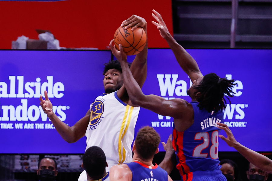 Dec 29, 2020; Detroit, Michigan, USA; Golden State Warriors center James Wiseman (33) and Detroit Pistons center Isaiah Stewart (28) goes for the rebound in the first half at Little Caesars Arena. Mandatory Credit: Rick Osentoski-USA TODAY Sports