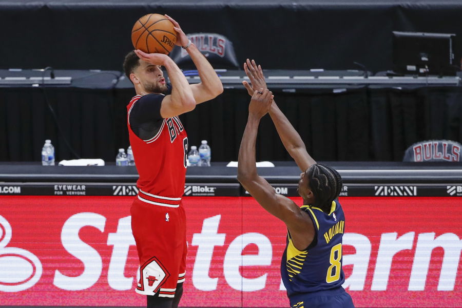 Dec 26, 2020; Chicago, Illinois, USA; Chicago Bulls guard Zach LaVine (8) shoots against Indiana Pacers guard Justin Holiday (8) during the first half of an NBA game at United Center. Mandatory Credit: Kamil Krzaczynski-USA TODAY Sports