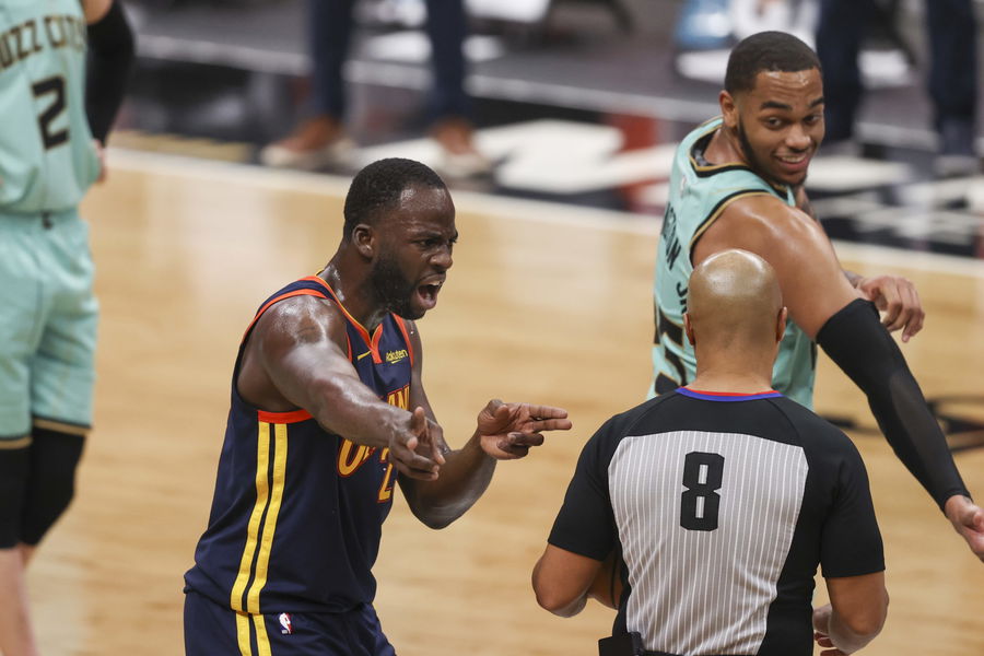 Feb 20, 2021; Charlotte, North Carolina, USA; Golden State Warriors forward Draymond Green, left, argues with referee Marc Davis (8) as Charlotte Hornets forward P.J. Washington looks on during the second half at Spectrum Center. The Charlotte Hornets won 102-100. Mandatory Credit: Nell Redmond-USA TODAY Sports