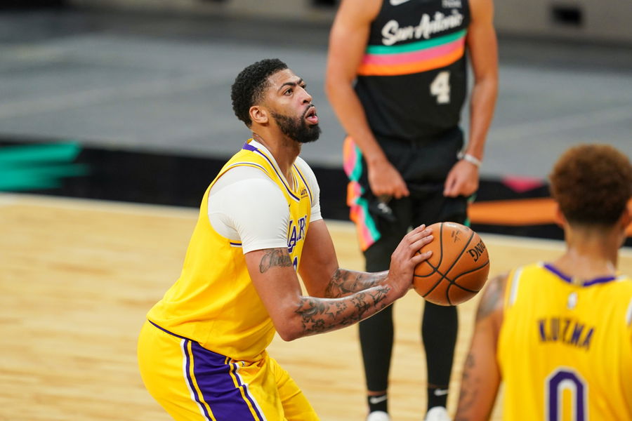 Jan 1, 2021; San Antonio, Texas, USA; Los Angeles Lakers forward Anthony Davis (3) shoots a free throw against the San Antonio Spurs in the second half at the AT&T Center. Mandatory Credit: Daniel Dunn-USA TODAY Sports