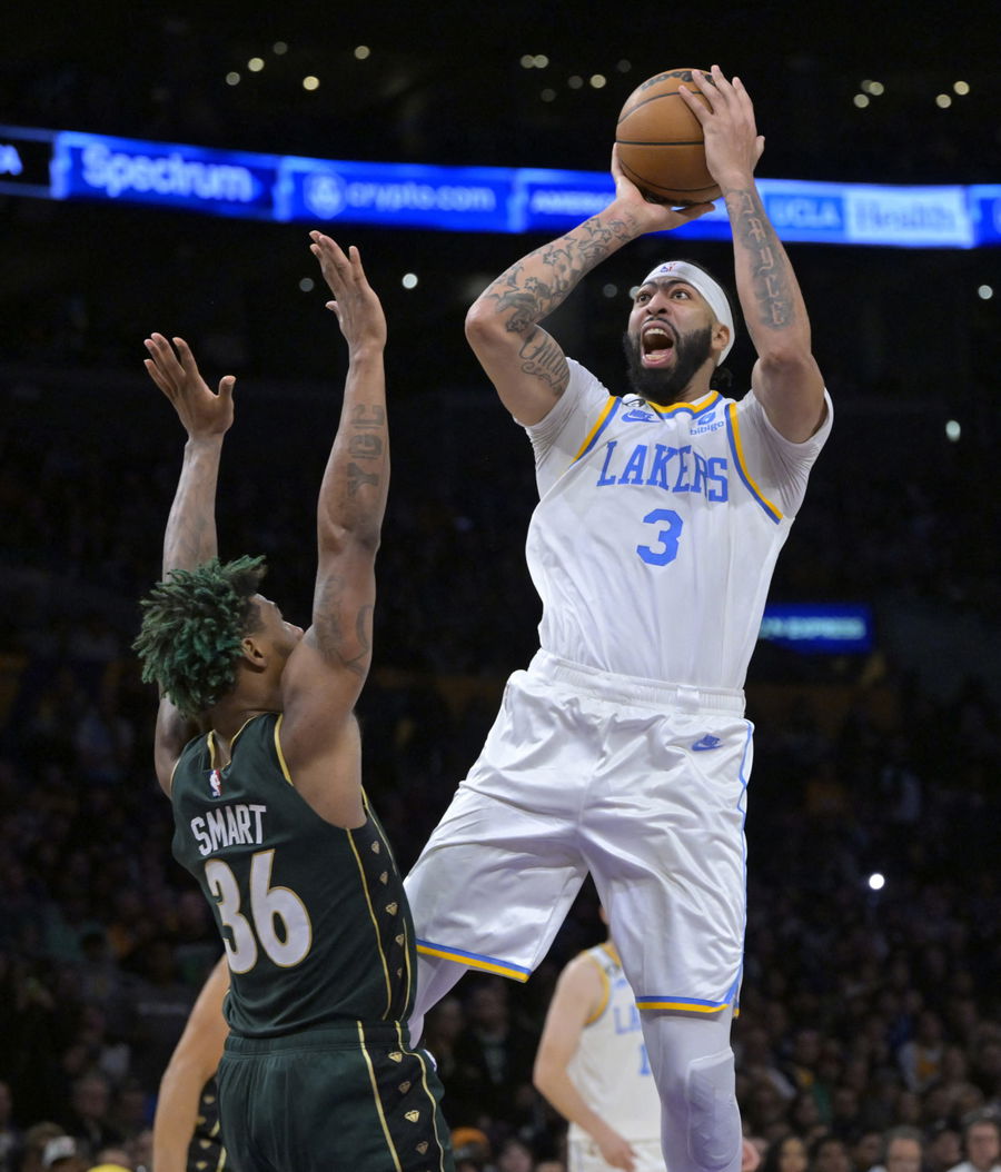 Dec 13, 2022; Los Angeles, California, USA; Los Angeles Lakers forward Anthony Davis (3) shoots over Boston Celtics guard Marcus Smart (36) in the second half at Crypto.com Arena. Mandatory Credit: Jayne Kamin-Oncea-USA TODAY Sports