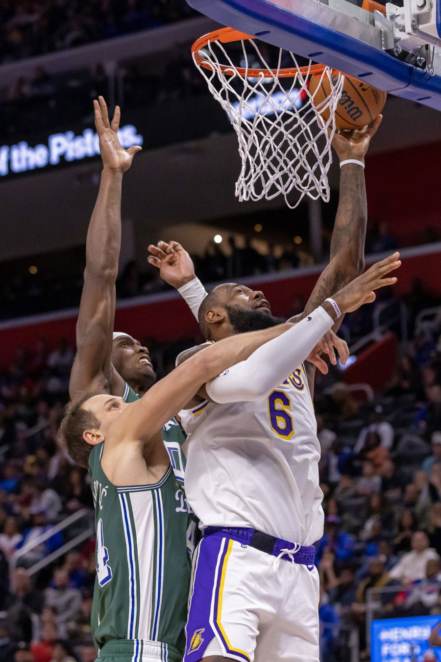 Dec 11, 2022; Detroit, Michigan, USA; Los Angeles Lakers forward LeBron James (6) drives to the basket on Detroit Pistons forward Bojan Bogdanovic (44) during the second half at Little Caesars Arena. Mandatory Credit: David Reginek-USA TODAY Sports