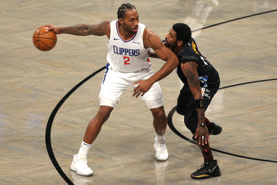 Feb 2, 2021; Brooklyn, New York, USA; Los Angeles Clippers small forward Kawhi Leonard (2) controls the ball against Brooklyn Nets point guard Kyrie Irving (11) during the first quarter at Barclays Center. Mandatory Credit: Brad Penner-USA TODAY Sports
