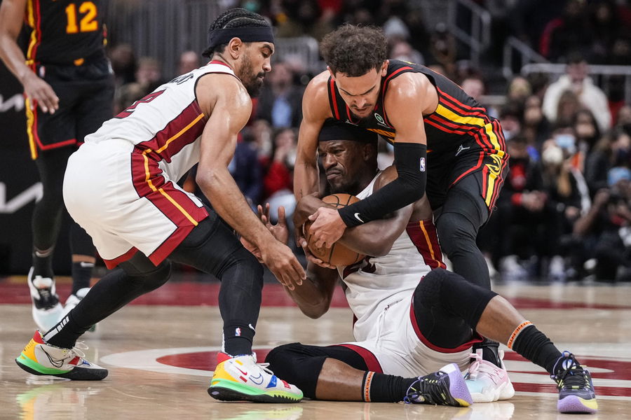 Jan 21, 2022; Atlanta, Georgia, USA; Miami Heat forward Jimmy Butler (22) and Atlanta Hawks guard Trae Young (11) fight for the ball on the court during the second half at State Farm Arena. Mandatory Credit: Dale Zanine-USA TODAY Sports