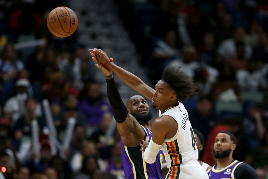Mar 27, 2022; New Orleans, Louisiana, USA; New Orleans Pelicans guard Devonte’ Graham (4) knocks the ball from Los Angeles Lakers forward LeBron James (6) in the second half at the Smoothie King Center. The Pelicans won, 116-108. Mandatory Credit: Chuck Cook-USA TODAY Sports