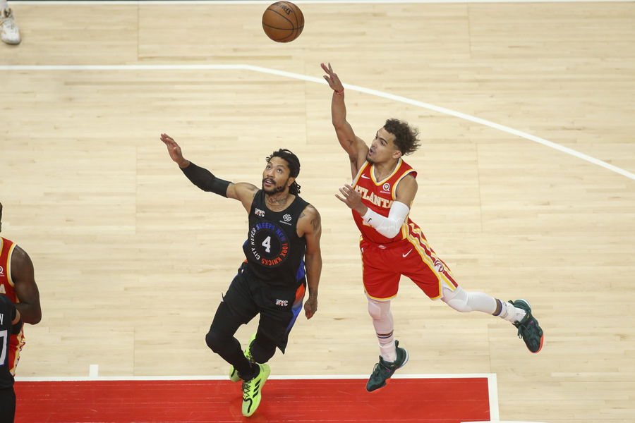 May 28, 2021; Atlanta, Georgia, USA; Atlanta Hawks guard Trae Young (11) shoots the ball over New York Knicks guard Derrick Rose (4) in the first quarter during game three in the first round of the 2021 NBA Playoffs at State Farm Arena. Mandatory Credit: Brett Davis-USA TODAY Sports
