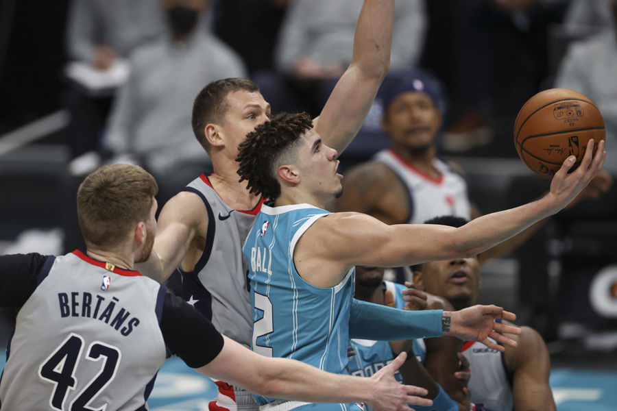 Feb 7, 2021; Charlotte, North Carolina, USA; Charlotte Hornets guard LaMelo Ball (2) drives to the basket ahead of Washington Wizards forward Davis Bertans in the second half at Spectrum Center. The Charlotte Hornets won 119-97. Mandatory Credit: Nell Redmond-USA TODAY Sports