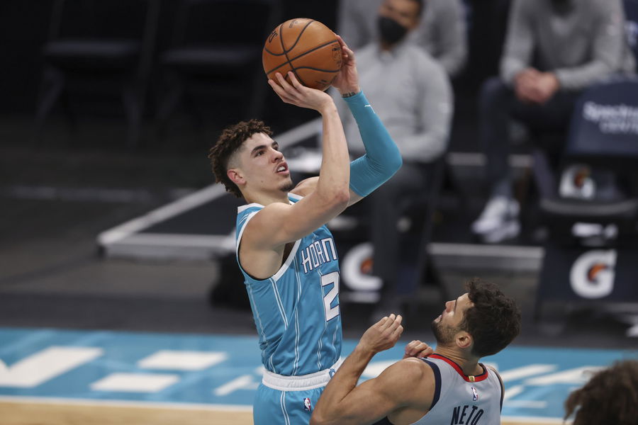 Feb 7, 2021; Charlotte, North Carolina, USA; Charlotte Hornets guard LaMelo Ball (2) shoots over Washington Wizards guard Raul Neto in the second half at Spectrum Center. The Charlotte Hornets won 119-97. Mandatory Credit: Nell Redmond-USA TODAY Sports