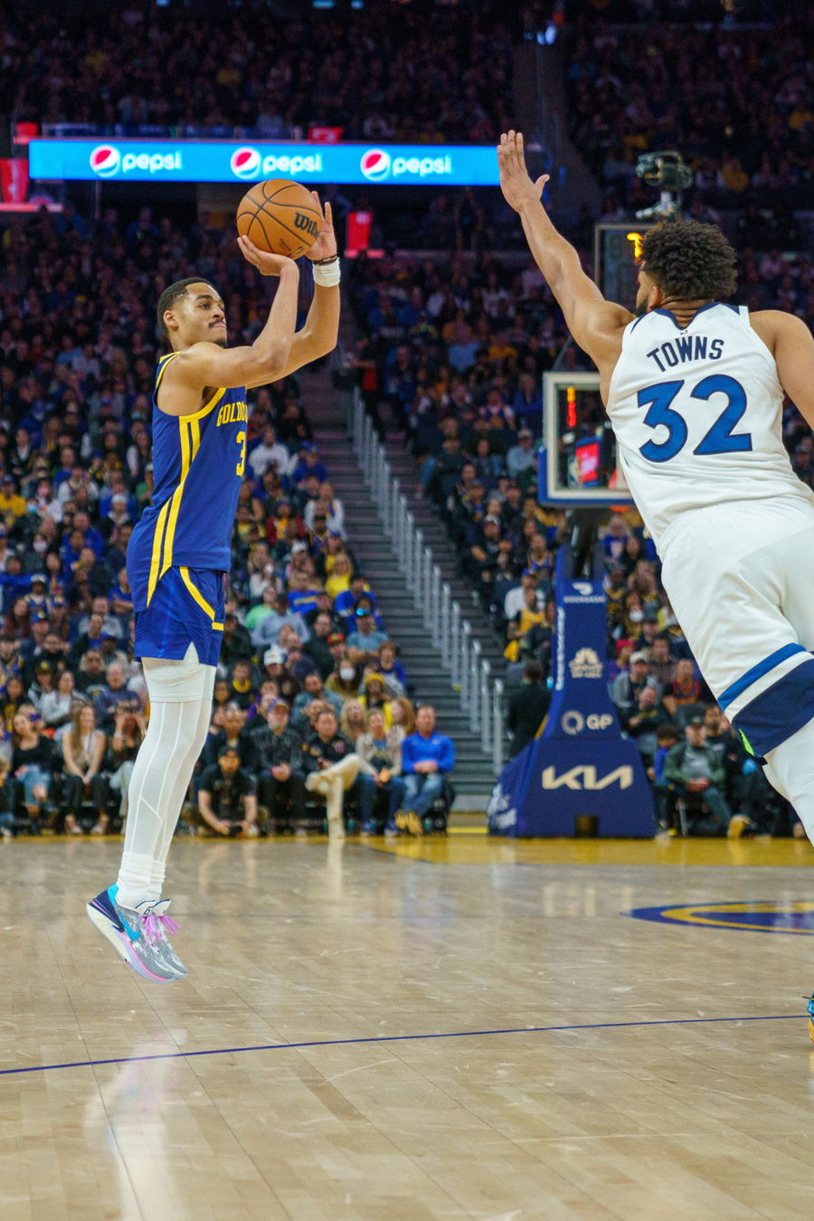 Mar 26, 2023; San Francisco, California, USA; Golden State Warriors guard Jordan Poole (3) shoots a three point basket during the third quarter against Minnesota Timberwolves center Karl-Anthony Towns (32) during the third quarter at Chase Center. Mandatory Credit: Neville E. Guard-USA TODAY Sports